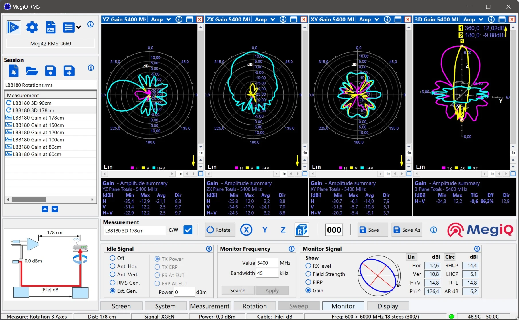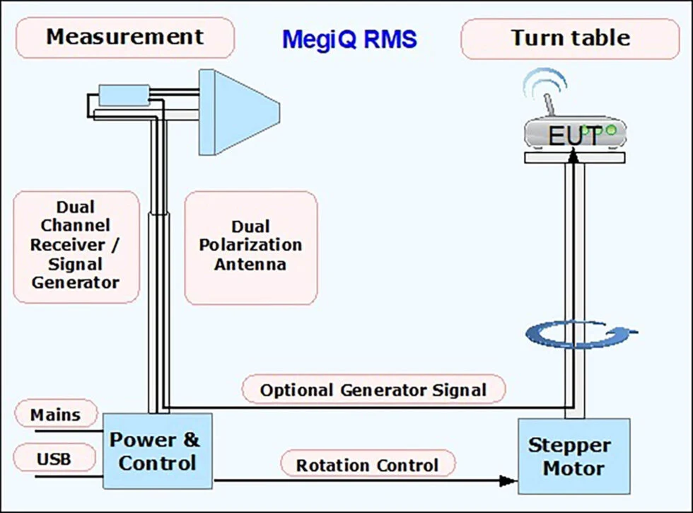 Das MegiQ Radiation Measurement System (RMS) ist ein kompaktes Testsystem, das 3-Achsen-Strahlungsmustermessungen in nicht-reflexionsarmen Räumen durchführt. Mit einem Frequenzbereich von 370 MHz bis 6 GHz eignet es sich ideal für die Charakterisierung von Antennen, IoT-Geräten, Routern, Smartphones und mehr.